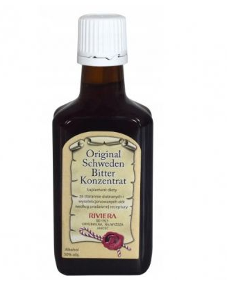 Krople Orginal Schweden Bitter Konzentrat to suplement diety w płynie. Zawiera roślinne ekstrakty z: mirry, korzenia arcydzięgla, korzenia ostryżu plamistego, korzenia mniszka lekarskiego, korzenia goryczki, korzenia kozłka lekarskiego, liścia orzecha włoskiego, ziela piołunu, ziela szanty, kory cynamonowca, kłącza pięciornika i kłącza tataraku oraz owocu kardamonu. Może stanowić uzupełnienie codziennej diety osób dorosłych.
