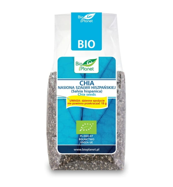 Ekologiczna Chia zwana też szałwią hiszpańską to gatunek rośliny zielnej kwitnącej latem, bardzo cenionej za swoje nasiona, które są ciekawym dodatkiem do diety. Można dodawać całe lub zmielone nasiona do musli, jogurtów, sałatek oraz wypieków. Można je również namoczyć w wodzie lub soku i używać jako naturalny zagęszczacz np. do zup.