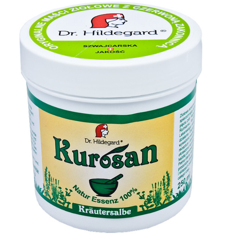 Dr. Hildegard Kurosan maść ziołowa to ziołowe smarowidło na suchą i spierzchniętą skórę. W swoim składzie zawiera kombinację ziół: nagietka, lawendy, rumianku, rozmarynu i żywokostu. Produkt ten przeznaczony jest do użytku zewnętrznego. Działa zmiękczająco i chroni przed pękaniem. Wykazuje działanie rozkurczające na drogi oddechowe, łagodzi stany zapalne i dolegliwości bólowe.