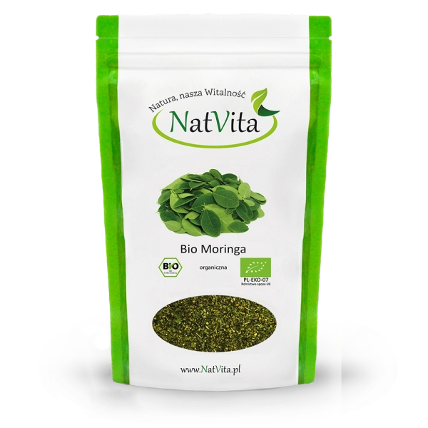 Moringa jest to tak zwane “drzewo cud” i jedna z najzdrowszych roślin naszej planety. W składzie Moringi znajduje się aż 46 substancji przeciwutleniających, co sprawia że jest ona jednym z najsilniejszych antyutleniaczy znanych w przyrodzie. Jej liście to prawdziwa kopalnia cennych substancji odżywczych, między innymi:witaminy A, C, E, K, magnezu, cynku, selenu, leucyny, choliny, zeatinu, chlorofilu, beta-sitosterolu, kampferolu, kwercetyny, rutyny, kwasu caffeoylquinic, luteiny, zeaksantyny, glutationu, beta-karotenu, karotenu Alpha – żeby wymienić najważniejsze z nich. W porównaniu z innymi roślinami, Moringa posiada znacznie wyższe stężenie witamin i minerałów:7 razy więcej witaminy C niż pomarańcze,4 razy więcej witaminy A niż marchew,3 razy więcej potasu niż banany.Ponadto zawiera:2 razy więcej białka niż soja,4 razy więcej wapnia niż mleko i bardzo duże ilości naturalnego chlorofilu.Dzięki bardzo dużej ilości naturalnych nienasyconych kwasów tłuszczowych (omega-3, -6 i -9), Moringa skutecznie wspomaga układ odpornościowy i utrzymuje zdrowy poziomu cukru i lipidów we krwi.Ze względu na swoje uniwersalne właściwości prozdrowatne Moringa pomaga w leczeniu ponad 300 chorób i ma uniwersalne zastosowanie profilaktyczne. W ramach zdrowej diety i zdrowego stylu życia powinno się zażywać 1 łyżeczki sproszkowanej Moringi dziennie. Dodanie tego wyjątkowego suplementu do żywności i napojów zwiększa ich wartości odżywcze.MORINGA LIŚCIE SKŁAD:100\% moringa liście suszoneMORINGA LIŚCIE SPOSÓB UŻYCIA:1 – 1 ,5 łyżeczki ciętych liści na 1 szklankę wody. Zalać gorącą wodą i parzyć 5 – 10 minut.